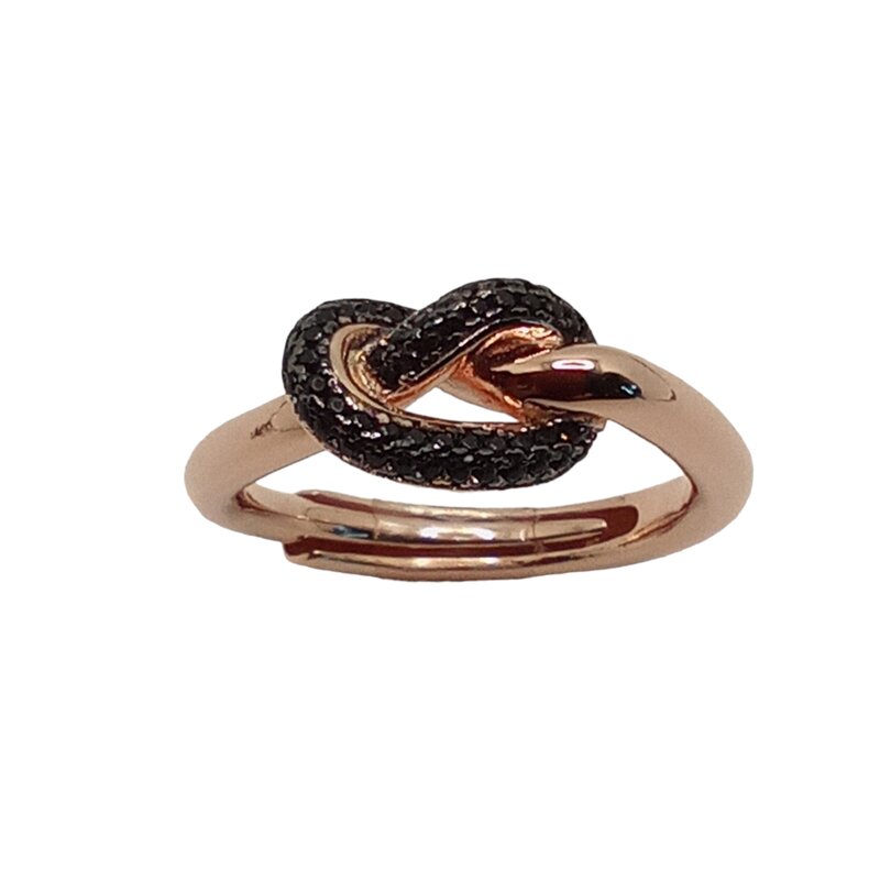 Anello in argento rosato con motivo a nodo in zirconi neri. Disponibile in misura 19 regolabile (nella pagina "negozio" trovi la tabella con le misure).