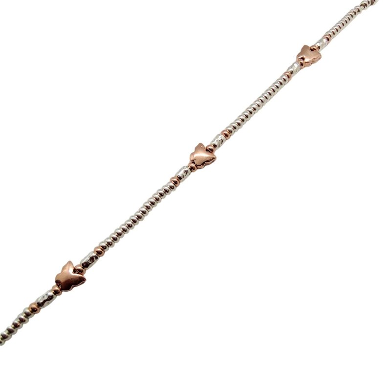 925‰  con inserti a forma di farfalla in argento rosato. Chiusura a moschettone.