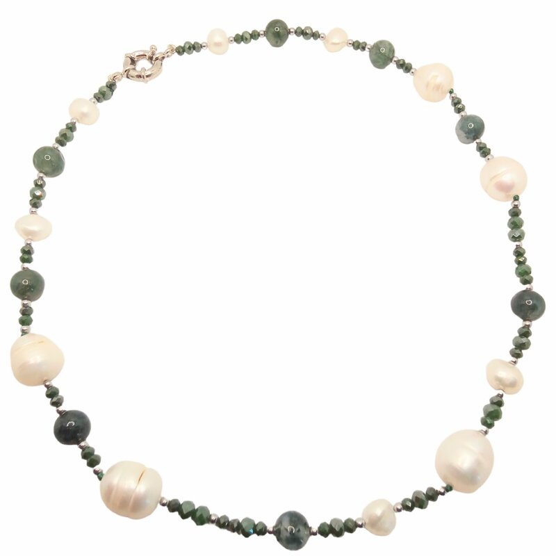 Collana in agata verde muschiata e vetro verde con moshettone in argento.