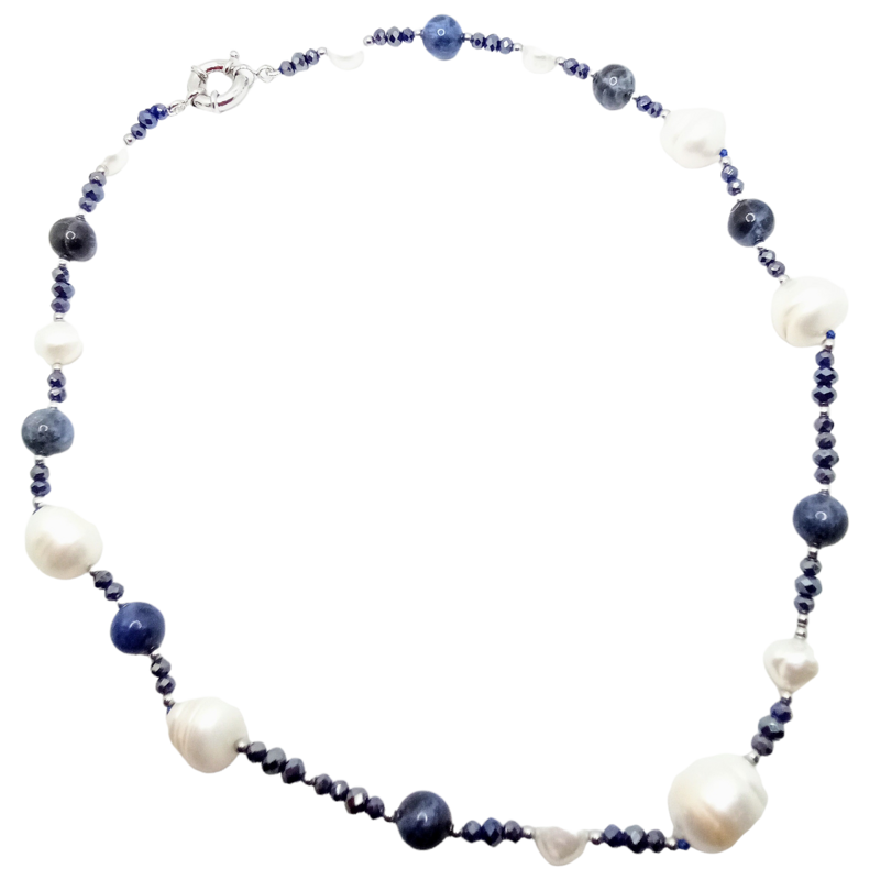 Collana in sodalite e vetro blu con chiusura a moschettone in argento.