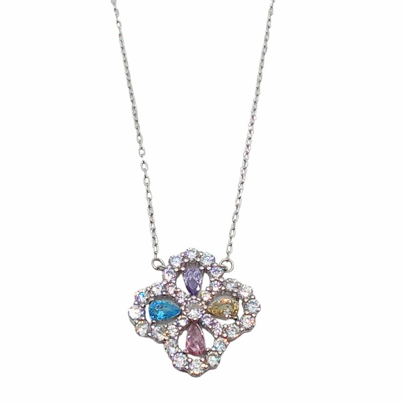 Il girocollo in argento 925‰. Misura dai 40 ai 45 cm con lunghezza regolabile in base alla misura del collo. La parte centrale (cm 1,2 x cm 1,2) reca un motivo floreale impreziosito da zirconi bianchi e colorati.