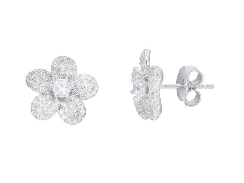 Il motivo floreale impreziosito da pavè di zirconi rende estremamente delizioso questo paio di orecchini a lobo.
