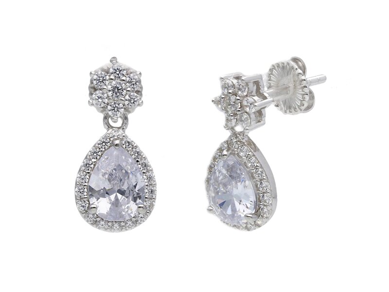 Orecchini pendenti a goccia in argento e zirconi 925‰ con chiusura a vite a scatto.