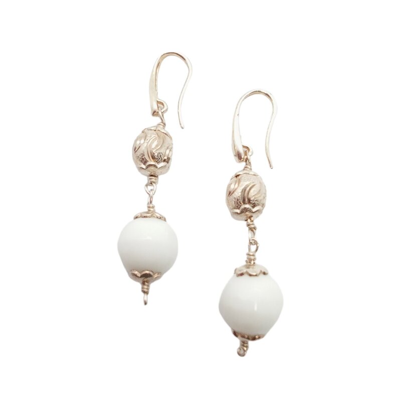 con agata bianca. L'allacciatura è ad amo, la parte pendente è impreziosita da una pallina incisa del diametro di mm 7 e da una in agata bianca faccettata di mm 10.