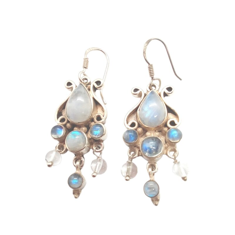 con labradorite. Di stile arabesque, gli orecchini recano sette labradoriti ciascuno: una a goccia e sei tonde di cui tre ciondolanti. La lunghezza è di cm 3,5.