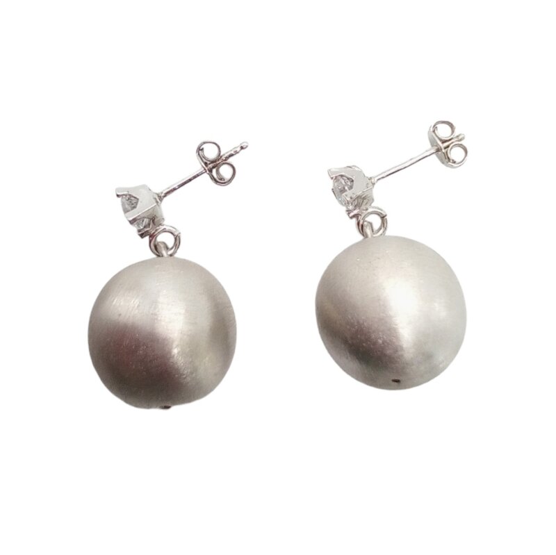 con zirconi bianchi e sfere satinate del diametro di mm 18. L'allacciatura è a vite a scatto e la lunghezza è di cm 3.